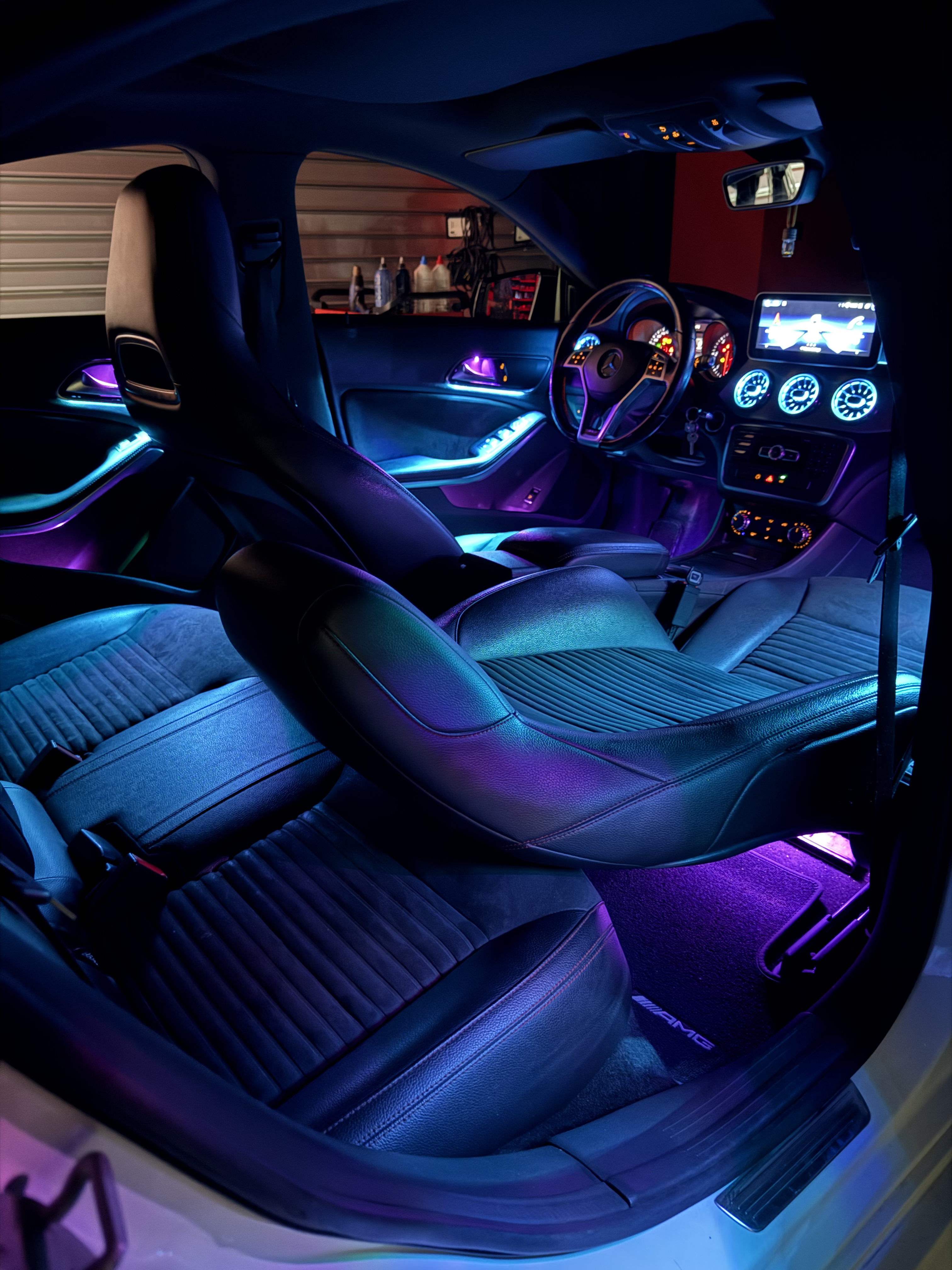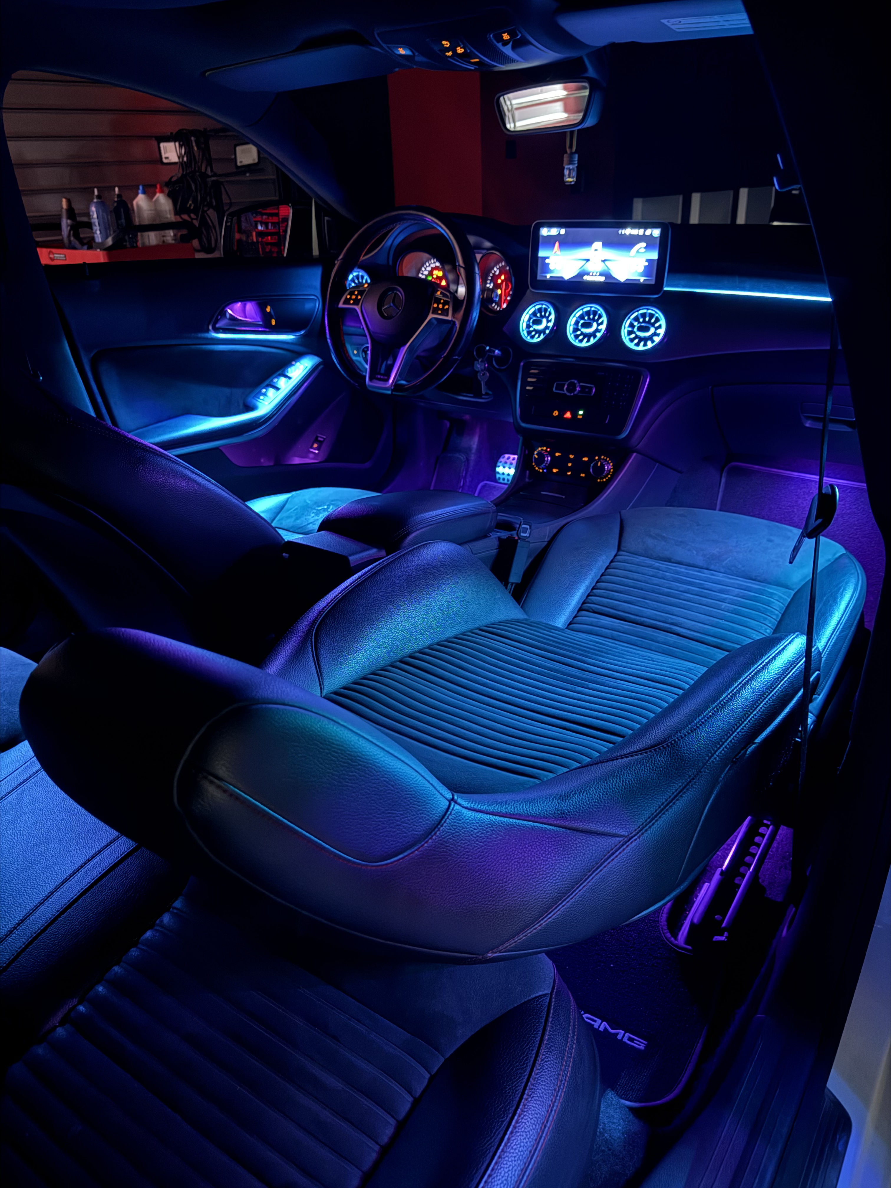 Στο συγκεκριμένο Mercedes CLA προχωρήσαμε σε εγκατάσταση ambient light φωτισμού με πλήρως εργοστασιακή εφαρμογή. Ο φωτισμός ενσωματώθηκε άψογα στο εσωτερικό του αυτοκινήτου, προσφέροντας ατμόσφαιρα υψηλής αισθητικής και λειτουργικότητας, χωρίς να αλλοιώνεται ο χαρακτήρας του οχήματος.