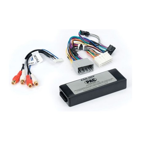 Plugs into the vehicle’s CAN bus and provides a stereo RCA audio output for adding aftermarket amplification. Provides full range audio output 20-20,000Hz. The volume of the factory radio controls the audio output level.
