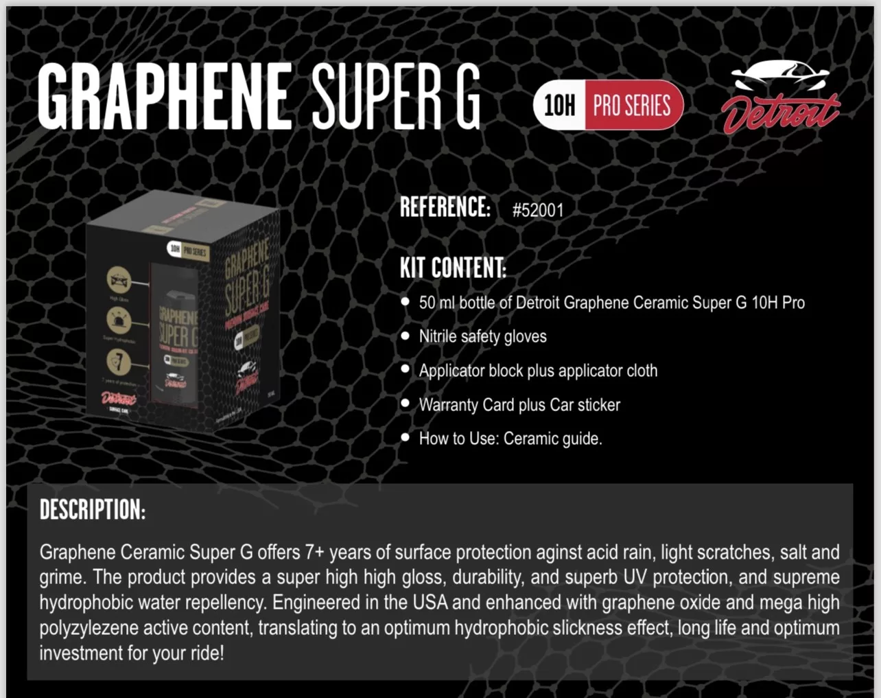 Το Graphene Super G προσφέρει 7+ χρόνια προστασίας χρώματος από όξινη βροχή, ελαφριές γρατσουνιές, αλάτι και βρωμιά. Σχεδιασμένο στις ΗΠΑ και ενισχυμένο με ισχυρή ποσότητα από οξείδιο του γραφενίου και υψηλής ποιότητας polyzylezene, μεταφράζεται σε βέλτιστο αποτέλεσμα υδρoφοβίας και στιλπνότητας, μεγάλη διάρκεια ζωής και σοβαρή επένδυση για το όχημα σας!