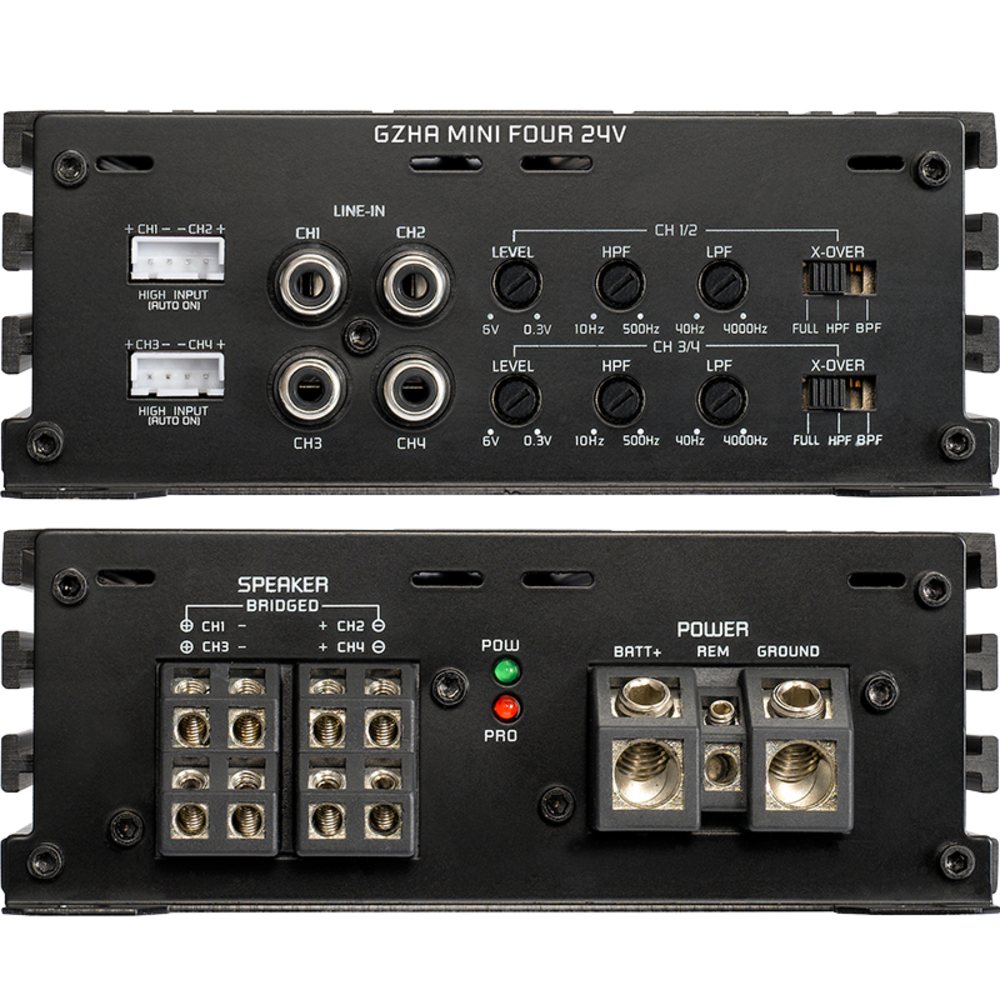 4-channel amplifier with high efficient class D circuit, integrated activ crossover and compact dimensions