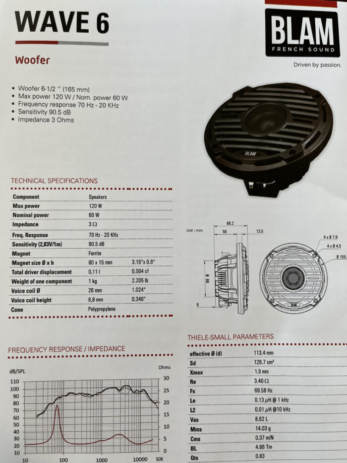 Max power: 120w. Nominal power: 60w. Impedance: 3Ω. Freq. responce: 70hz-20khz. Sensitivity(2,83v/1m): 90,5 db. Magnet: ferite. Magnet size: 80x15mm. Total driver displacement 0,111. Weight of one component 1kg. Voice coil 26mm. Voice coil height 8,8mm. Cone polypropylene.